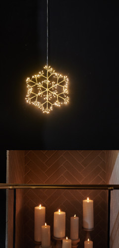 Available in two colours: Silver or Copper1800 warm white LEDs with a flickering effectMains poweredHanging ornamentIlluminated diameter: 40cmLead wir..